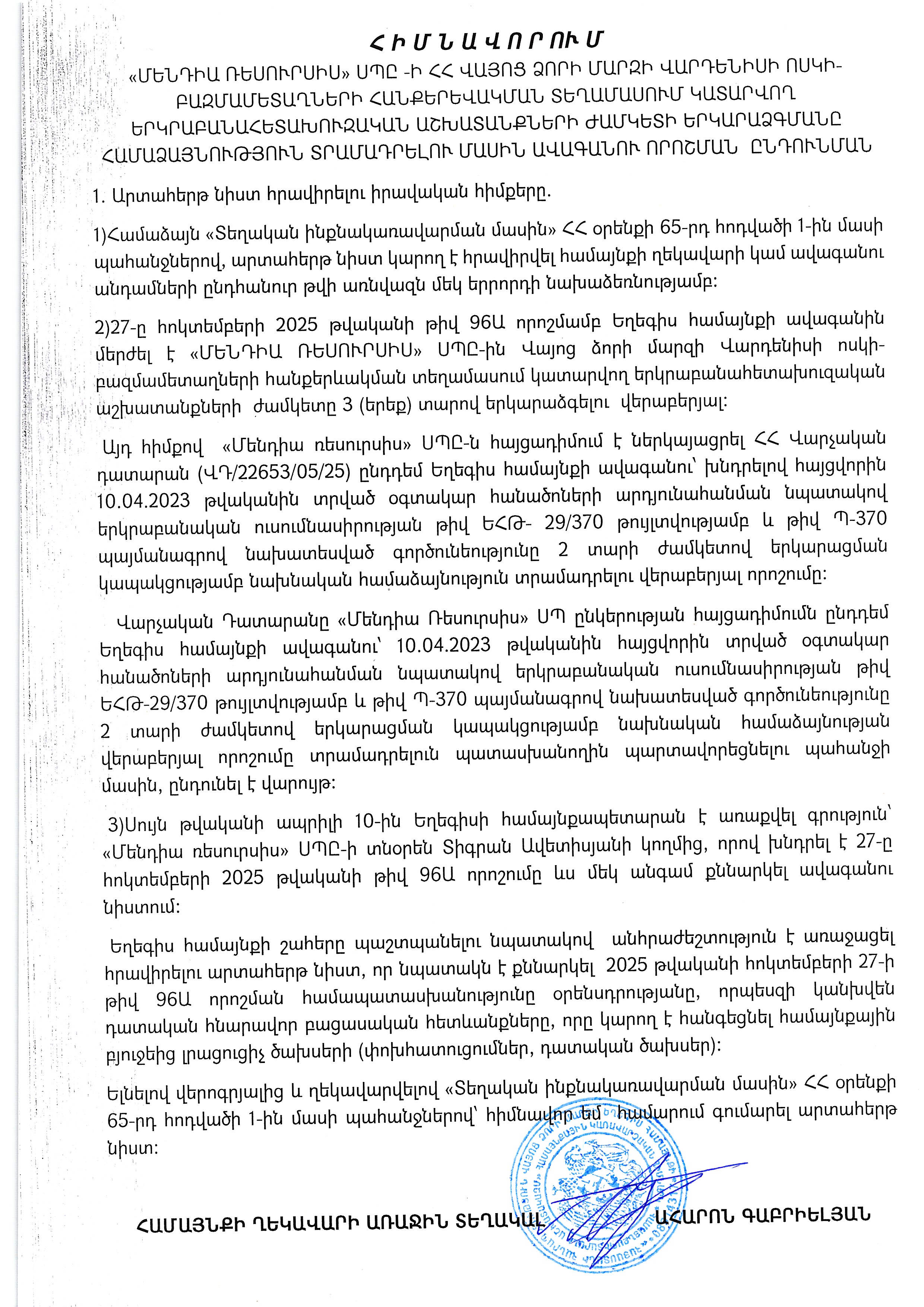 Ղեկավարվելով «Տեղական ինքնակառավարման մասին» Հայաստանի Հանրապետության օրենքի 18-րդ հոդվածի 1-ին մասի 21-րդ և 42-րդ կետերով, «Հայաստանի Հանրապետության օրենքը շրջակա միջավայրի վրա ազդեցության գնահատման և փորձաքննության մասին» Հայաստանի Հանրապետության օրենքի 16-րդ հոդվածի 3-րդ մասով և Հայաստանի Հանրապետության կառավարության 2023 թվականի դեկտեմբերի 28-ի «Հայաստանի Հանրապետության կառավարության 2014 թվականի նոյեմբերի 19-ի N 1325-Ն որոշման մեջ փոփոխություն կատարելու մասին» N 2343-Ն որոշման պահանջներով